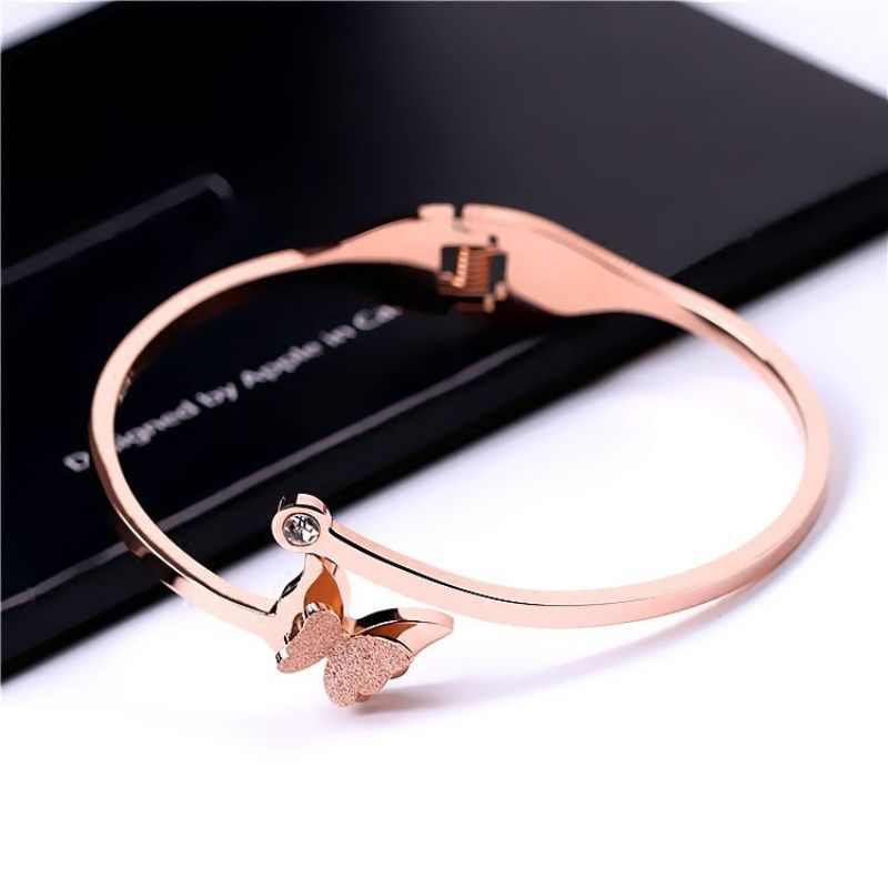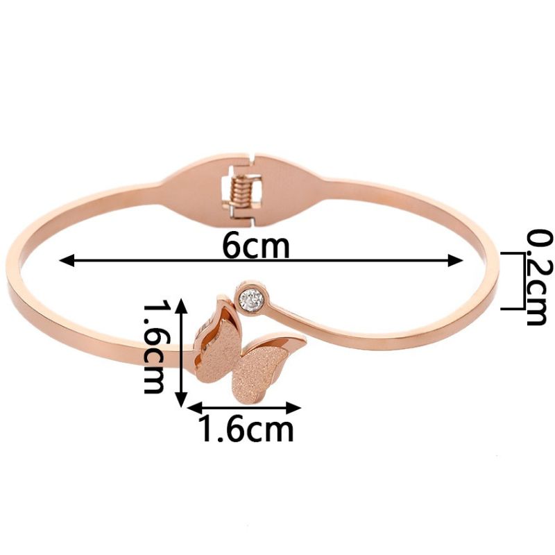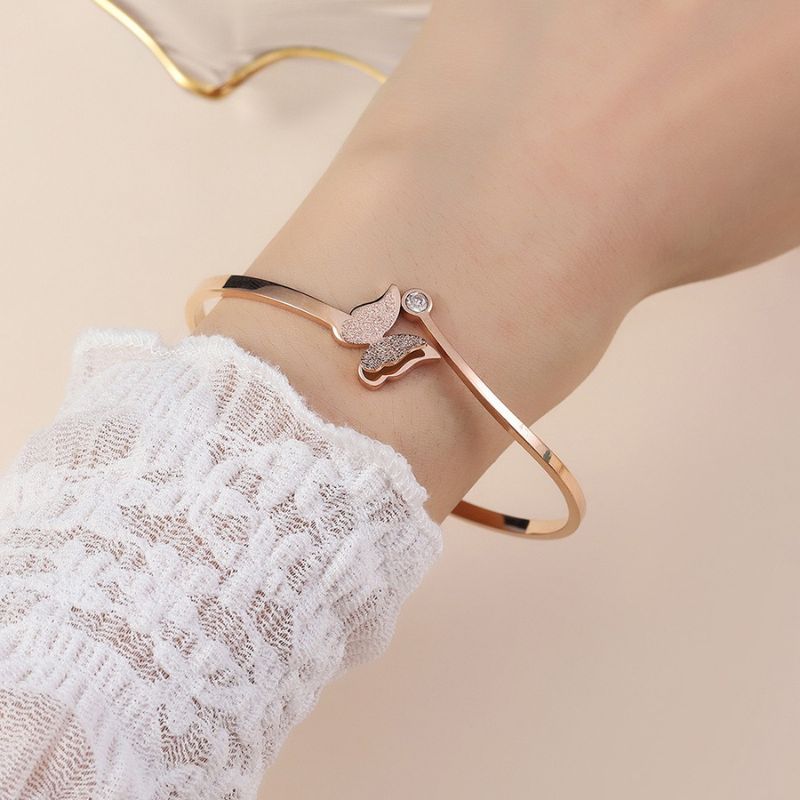 1. Graceful 18k rosegold plated butterfly end bangle shape bracelet for women with zircon inlaid and open adjustable end.