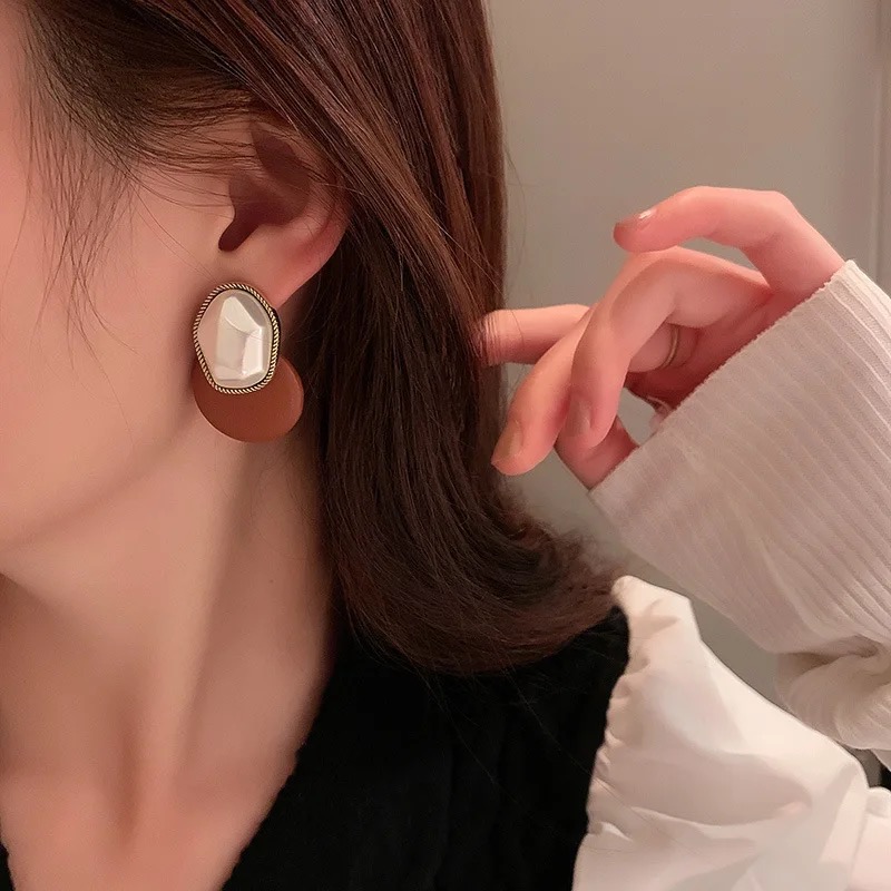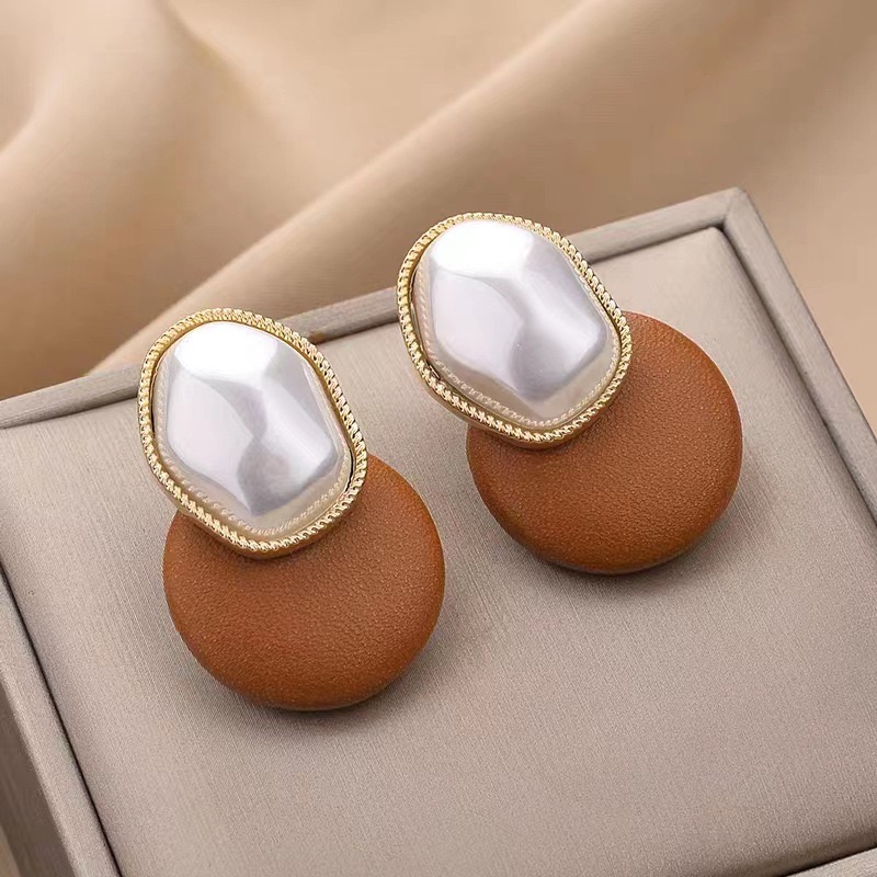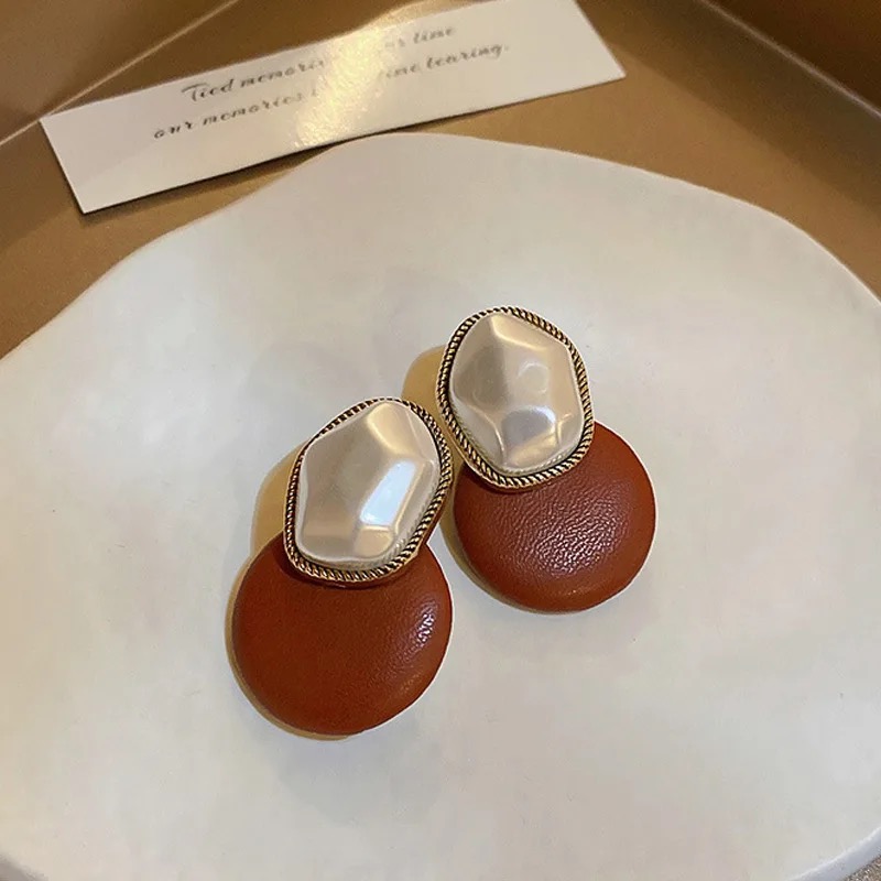 Gold Plated Irregular Pearl with vintage brown leather earring