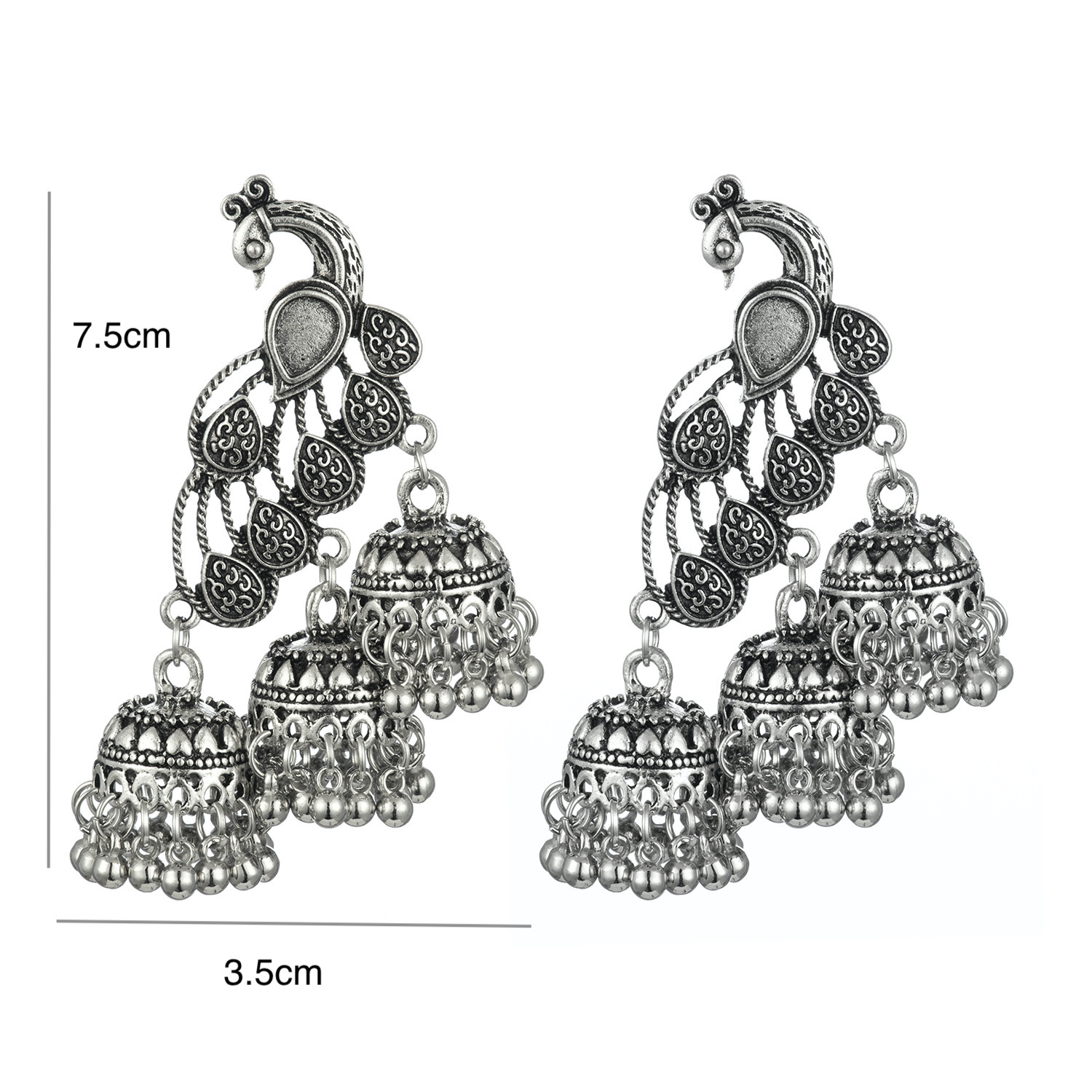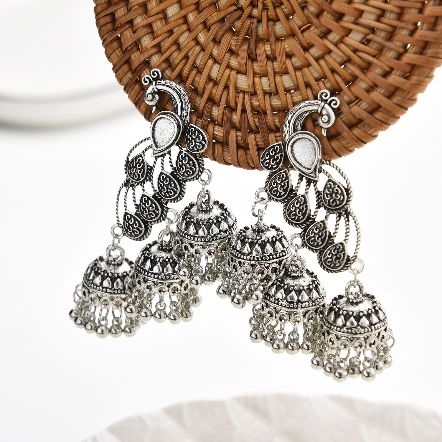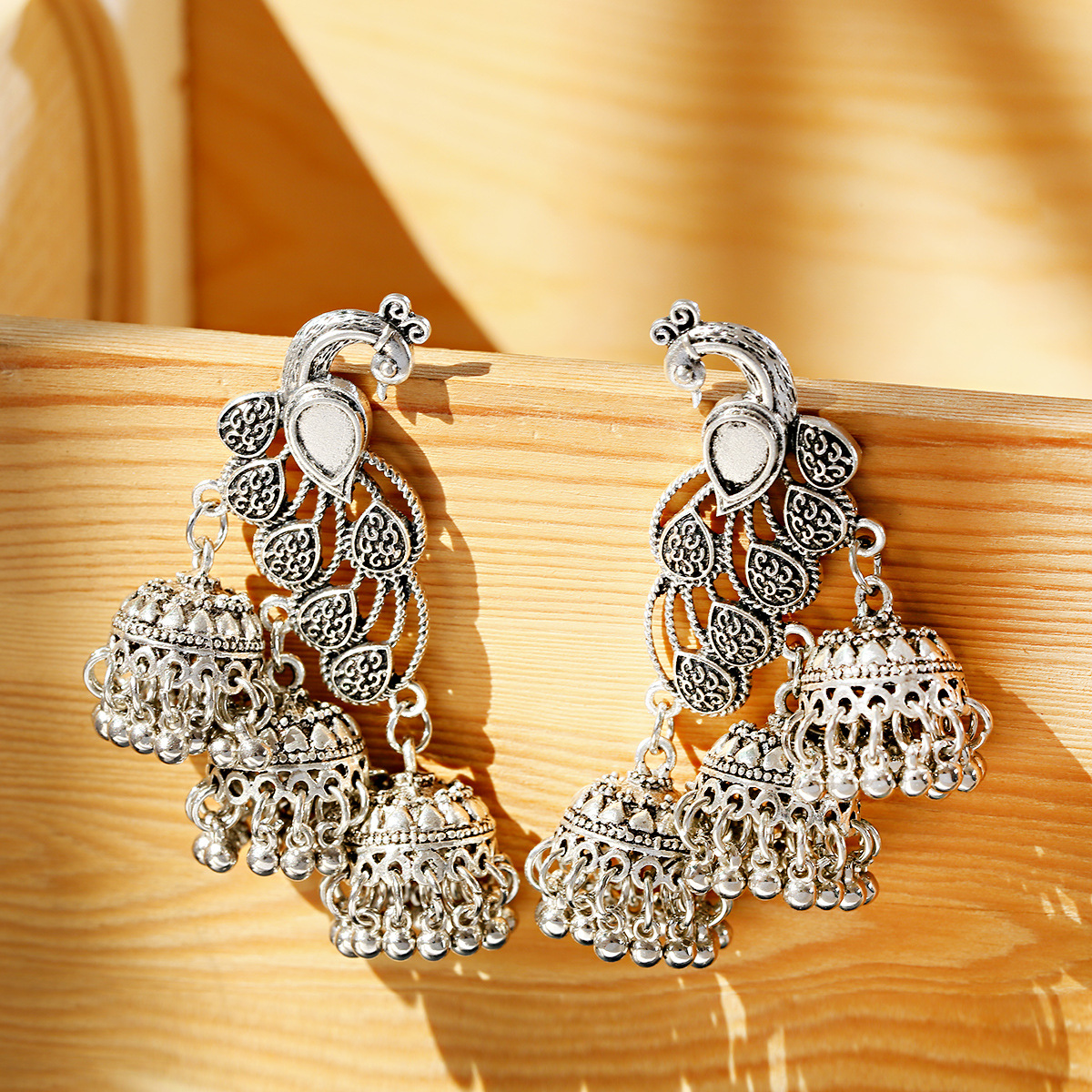 1. Antique silver plated, peacock shape top with bells drop earrings for women.